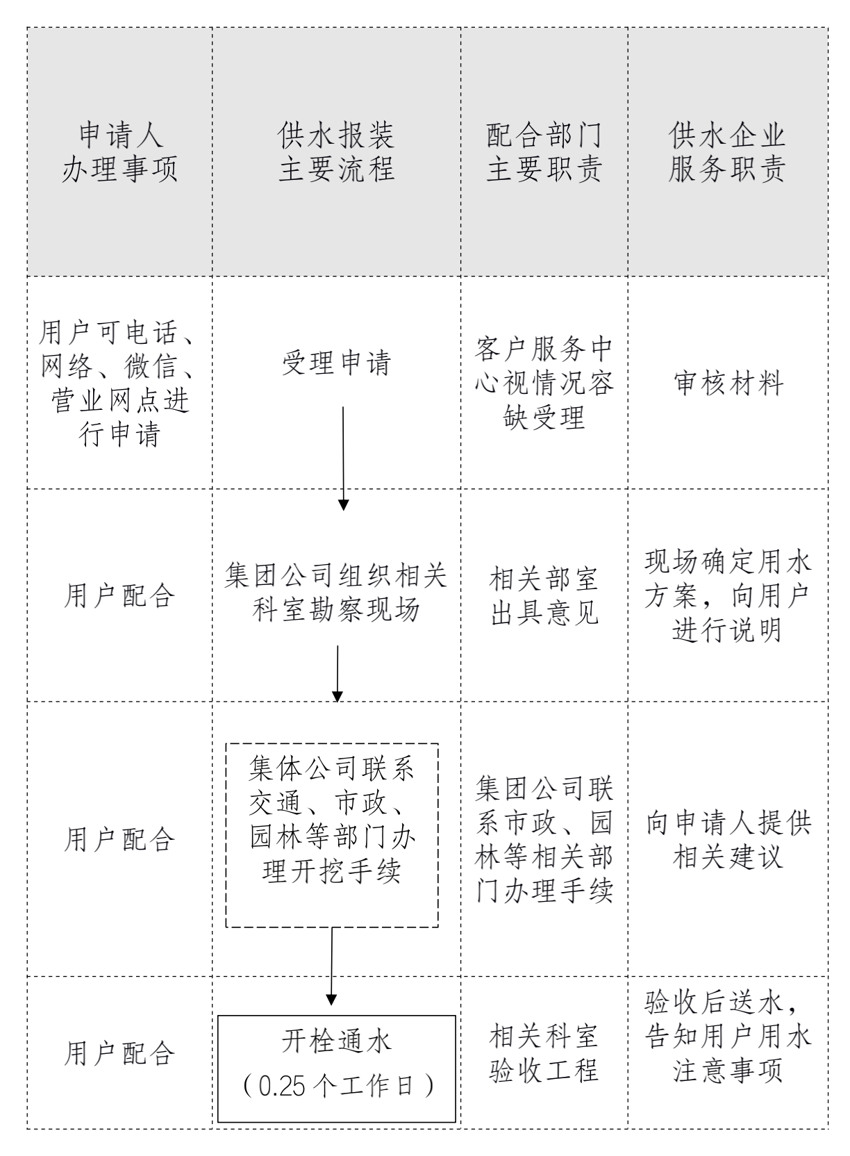 通過加強企業部門間配合協作,提高工作效率等措施,將供水報裝業務辦理時長壓縮為0.25個工作日。(該時限不包含合同簽訂、施工、辦理道路、綠化等相關行政審批等無法控制的時間)